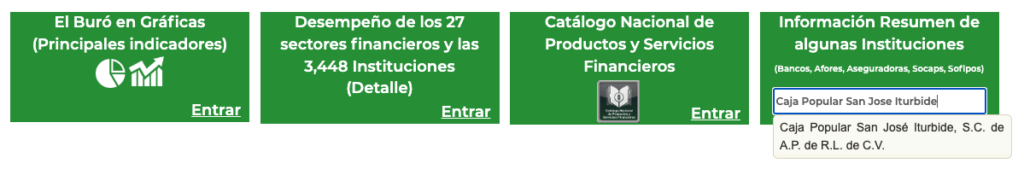 Para información específica de nosotros, en el recuadro de «INFORMACIÓN RESUMEN DE ALGUNAS INSTITUCIONES» teclea la palabra «Caja Popular San Jose Iturbide» y selecciona «Caja Popular San José Iturbide, S.C. de A.P. de R.L. de C.V.»