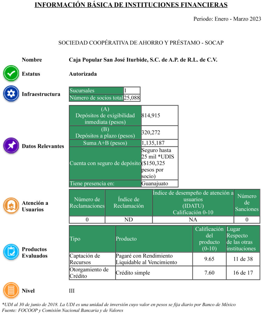 El Buró de Entidades Financieras contiene información de Caja Popular San José Iturbide, S.C. de A.P. de R.L. de C.V. sobre las características de nuestros productos y nuestro desempeño frente a los Usuarios en la prestación de servicios.